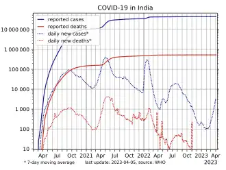 The COVID-19 pandemic in India is a part of the COVID-19 pandemic. COVID-19 is caused by SARS-CoV-2. As of 20 October 2025, according to Indian government figures, India has the second-highest number of confirmed cases in the world (after the United States) with 45,056,117[4] reported cases of COVID-19 infection and the third-highest number of COVID-19 deaths (after the United States and Brazil) at 533,847[4] deaths.[6][7] In October 2021, the World Health Organization estimated 4.7 million excess deaths, both directly and indirectly related to COVID-19 to have taken place in India.[8][9]