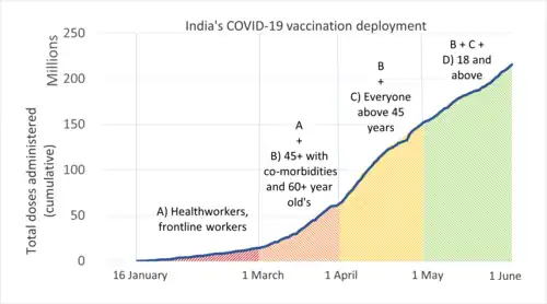 India started out with a vaccination policy targeting 300 million people based on occupation and age group, to be completed a time period of six months, by August 2021.[176][177]