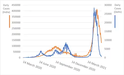 - ↑ Singh, Karan Deep; Gettleman, Jeffrey (8 October 2020). "'Rural Surge' Propels India Toward More Covid-19 Infections Than U.S." The New York Times. ISSN 0362-4331. Retrieved 15 May 2021.