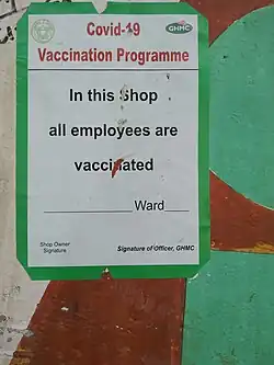 Administratively, India began preparing to vaccinate its population in April 2020 with the setting up a Vaccine Task Force.[170] Following this the National Expert Group on Vaccine Administration for COVID-19 (NEGVAC) was formed,[171] and in October 2020 states were asked to set up state level mechanisms for the COVID-19 vaccine programme,[172] and prepare cold chains points.[173][174] A communication strategy for the vaccination programme was also revealed by the health ministry in January 2021, targeting issues such as vaccine eagerness and hesitancy.[175]
