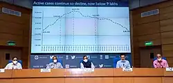 A government panel on COVID-19 stated in October 2020 that the pandemic had peaked in India, and could come under control by February 2021.[36] This prediction was based on a mathematical simulation referred to as the "Indian Supermodel", assuming that India reaches herd immunity.[37] That month, a new SARS-CoV-2 variant, Lineage B.1.617, was detected in the country.[38]