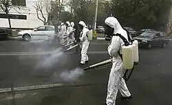 On 2 March, the government announced plans to mobilise 300,000 soldiers and volunteers to combat the spread of the virus, as well as to deploy drones and water cannons to disinfect streets.[171] On 13 March, a plan was announced to clear streets, shops, and public places by the Revolutionary Guards. In addition, 1,000 fixed and mobile detection clinics would be set up, the army would work alongside medical staff as well as producing face masks and gloves, and army beds would be made available for patients.[172]