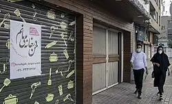 On 19 February 2020, Iran reported its first confirmed cases of infections in Qom.[5] The virus may have been brought to the country by a merchant from Qom who had travelled to China.[6] In response, the Government of Iran cancelled public events and Friday prayers; closed schools, universities, shopping centres, bazaars, and holy shrines; and banned festival celebrations.[7][8] Economic measures were also announced to help families and businesses, and the pandemic is credited with compelling the government to make an unprecedented request for an emergency loan of five billion US dollars from the International Monetary Fund.[9] The government initially rejected plans to quarantine entire cities and areas, and heavy traffic between cities continued ahead of Nowruz, despite the government's intention to limit travel. The government later announced a ban on travel between cities following an increase in the number of new cases.[8][10] Government restrictions were gradually eased starting in April. The number of new cases fell to a low on 2 May, but increased again in May as restrictions were eased, with a new peak of cases reported on 4 June,[11] and new peaks in the number of deaths reported in July.[12] Despite the increase, the Iranian government stated that it had no option but to keep the economy open;[13] the economy of Iran was already affected by US sanctions, and its GDP fell by a further 15% due to the COVID-19 pandemic by June 2020.[14]