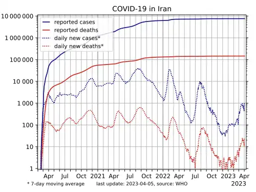 The COVID-19 pandemic in Iran has resulted in 7,627,863[2] confirmed cases of COVID-19 and 146,837[2] deaths.