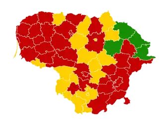 - ↑ "Sprendimas dėl savivaldybių, priskiriamų žaliajai, geltonajai ir raudonajai zonai, nustatymo" (PDF). sam.lrv.lt (in Lithuanian). Retrieved 25 October 2020.