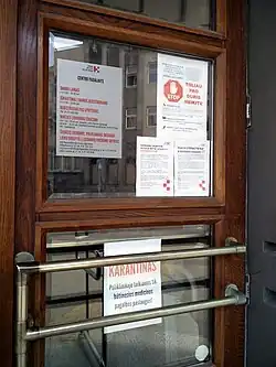 - ↑ Tracevičiūtė, Roberta (24 March 2020). "Vilniuje – pirmieji priverstiniai karantinuojamieji: jie išsiųsti į viešbutį, bus saugomi". 15min.lt (in Lithuanian). Retrieved 24 March 2020.