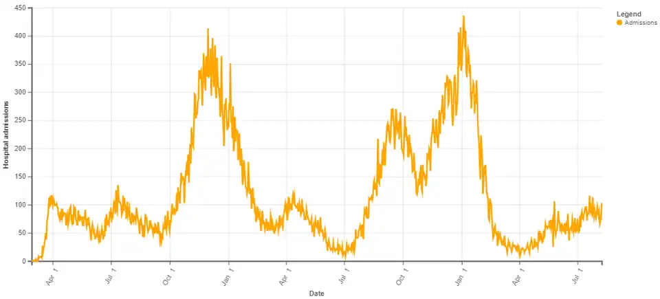 As of August 1, a total of 1,130,134 cases had been reported leading to 61,939 hospitalizations.[90] As of August 12, a total of 1,152,590 cases had been reported.[91] As of August 20, a total of 1,175,340 cases has been reported.[92] By August 27, the number of cases surpassed 1.2 million.[93]