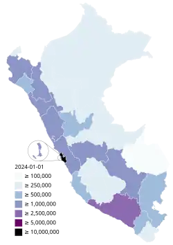 Peru's health ministry announced on 13 August that Peru had surpassed 500,000 confirmed cases, noting that 507,996 cases and 25,648 deaths were recorded.[46] On 22 August, at least thirteen people were killed during the Los Olivos stampede in the Los Olivos District of Cono Norte.[47] Quarantine Areas (as of 28 August 2020): Amazonas (Bagua, Chachapoyas, Condorcanqui, and Utcubamba); Ancash (Santa, Casma, and Huarmey); Apurimac (Abancay); Arequipa (Cailloma, Camaná, Castilla, Islay); Ayacucho (Huamanga, Huanta, Lucanas, and Parinacochas); Cajamarca (Cajamarca and Jaen); Cusco (entire region); Huancavelica (Huancavelica, Angaraes, and Tayacaja); Huánuco (Huánuco, Leoncio Prado, Puerto Inca, and Humalíes); Ica (Ica, Pisco, Nasca, and Palpa); Junin (Huancayo, Satipo, and Chanchamayo); La Libertad (Trujillo, Virú, Sánchez Carrión, Pacasmayo, Chepén, and Ascope); Lima (Barranca, Cañete, Huaura, and Huaral); Madre de Dios (Tambopata); Moquegua (entire region); Pasco (Pasco and Oxapampa); Puno (entire region); and Tacna (entire region).[48]