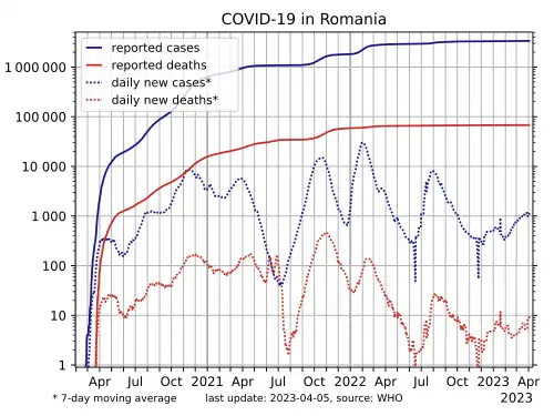 The COVID-19 pandemic in Romania, a part of the worldwide pandemic, began on 26 February 2020 when the first case of coronavirus disease 2019 (COVID-19) caused by severe acute respiratory syndrome coronavirus 2 (SARS-CoV-2) in Romania was confirmed in Gorj County was confirmed.[3]