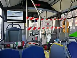 Translation: Access without a protective mask to the means of transport is prohibited. Attention! Wearing the mask in the means of transport is mandatory! Keep your social distance. For your own safety, please observe the following rules: - wearing a mask is mandatory during the trip. - keep a distance of at least 1.5 m between you in the means of transport, in the stations and at the points of sale of tickets and season tickets - please do not use the seats marked in red - please avoid congestion in the means of transport. Thank you for understanding, your health is important to us!