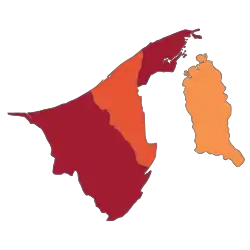 Brunei confirmed its first case on 9 March 2020 in Tutong, involving a 53-year-old man who had returned from Kuala Lumpur, Malaysia on 3 March.[9] It has spread to all districts of Brunei.