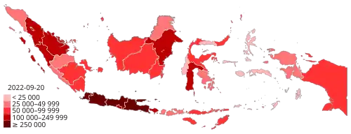 Indonesia reported its first cases on 2 March 2020, after a dance instructor and her mother were tested positive for the virus. Both were in contact with a Japanese national who was later tested positive in Malaysia.[11] By 9 April, it had spread to all 34 provinces in the country. Jakarta, West Java, and Central Java are the worst-hit provinces.