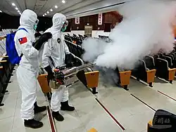The Taiwan Tobacco and Liquor Corporation and the Taiwan Sugar Corporation increased production of 75 per cent alcohol for use in sanitation.[204] On 25 February 2020, the Heping Women and Children's Hospital, a branch of the Taipei City Hospital, was specially designated to care for patients with coronavirus.[205] From 4–31 March, the export of digital thermometers was banned.[206][207] On 16 March, the Tsai Ing-wen presidential administration announced that Makalot Industrial and other Taiwanese companies would begin domestic mass production of protective gowns, ending a reliance on American imports from DuPont during the pandemic.[208] A ban on the export of hand sanitizers and other disinfectants was announced on 1 May 2020.[209]