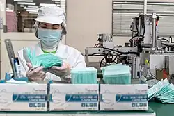 On 2 February 2020, Taiwan's Central Epidemic Command Center postponed the opening of primary and secondary schools until 25 February (originally 11 February).[200][201] In early February 2020, Taiwan's "Central Epidemic Command Center" requested the mobilization of the Taiwanese Armed Forces in both containing the spread of the virus and in building up defenses against it. Soldiers were dispatched to the factory floors of major mask manufacturers to help staff the 62 additional mask production lines that were being set up at the time.[202] In early March, Taiwan's average production of surgical face masks reached 9.2 million per day.[203] By the end of March, the daily production of surgical face masks reached 13 million.[198]