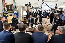 Many of the infections appeared to be related to a ceremony held on September 26 in the Rose Garden for the nomination of Amy Coney Barrett to the Supreme Court, where seating was not socially distanced and participants were mostly unmasked. Trump himself may have been infectious at that point, but he and his entourage attended several subsequent events unmasked, including the first presidential debate against Joe Biden in Cleveland, Ohio on September 29.[61] The next day, Presidential Counselor Hope Hicks was placed in quarantine aboard Air Force One while returning with Trump from a campaign event in Minnesota. Following that, the president proceeded on schedule to an October 1 New Jersey fundraiser where he mingled, unmasked, with donors.[62] More infections were reported in late October among Vice President Mike Pence's staff,[63] and a second large outbreak occurred after Election Day, after Trump held a watch party in the East Room.[64]