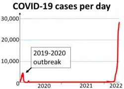 On 26 July, China saw its highest number of daily cases since March, mostly from outbreaks in Xinjiang and Liaoning,[80] with 61 new cases, up from 46 cases a day earlier.[81] This increased to 127 daily COVID cases on 30 July.[82] The daily reported cases subsequently went down, to 16 on 23 August.[83]