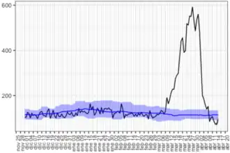 ![]() Daily deaths in Madrid, 25 November 2019 – 6 April 2020. Recent dates are incomplete. | |