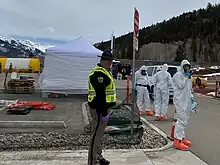On March 13, drive-through testing in the U.S. began in New Rochelle, Westchester County, as New Rochelle was the U.S. town with the most diagnosed cases at that time.[29] By March 22, drive-through testing had started in more than thirty states, although the Associated Press reported that "the system has been marked by inconsistencies, delays, and shortages", leading to many people waiting hours or days even though they showed symptoms and were recommended by a doctor to get a test. A lack of supplies had already forced the closure of drive-through testing in seven states.[30]