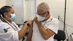 On 23 January 2021, in a symbolic act, vaccination was started in Brazil with the Oxford immunizer. The first person to receive the vaccine was the infectologist Estevão Portela.[32] At the same occasion the pneumologist Margareth Dalcolmo was also vaccinated. Doctor Sarah Ananda Gomes was the third to be vaccinated. Soon after, seven more health professionals were immunized.[33][34]