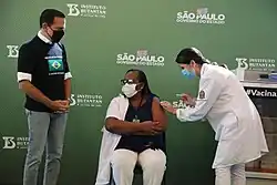 The vaccination campaign throughout the country would have started on 18 January 2021, at 5 pm (UTC-3), however, due to logistical problems, part of the states postponed it to the 19th, since the vaccines would only arrive at night. The states that started vaccination on the 18th were São Paulo, Rio de Janeiro, Rio Grande do Sul, Amazonas, Mato Grosso, Paraná, Pernambuco, Minas Gerais, Espírito Santo, Maranhão, Tocantins, Mato Grosso do Sul, Ceará, Goiás, Piauí, and Santa Catarina.[23] Mostly nursing technicians, nurses, blacks, and women were responsible for opening the vaccination campaign in the states.[24][25][26][27][28][29]