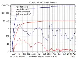 The case fatality ratio for COVID-19 has been much lower than SARS of 2003,[13][14] but the transmission has been significantly greater, with a significant total death toll.[13][15] Between 3 January 2020 and 14 April 2022, there were 752,188 confirmed cases of COVID-19 in Saudi Arabia with 9,062 deaths, reported to the World Health Organisation (WHO).[16]