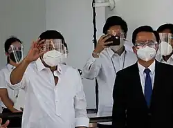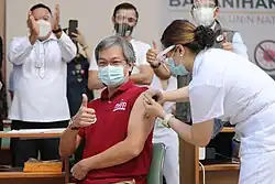 The rollout for the Philippines' national vaccine program began on March 1, 2021, shortly after the arrival of 600,000 doses of Sinovac's vaccine.[22] Philippine General Hospital director and doctor Gerardo Legaspi officially became the first recipient of a COVID-19 vaccine in the country.[23] The initial batch will cover around 50,000 military personnel and 250,000 health workers.[24] As of March 3, 2021, vaccinations has been limited to Metro Manila and to health workers.[25] However, select government officials were vaccinated in a bid to boost confidence on the vaccine.[26]
