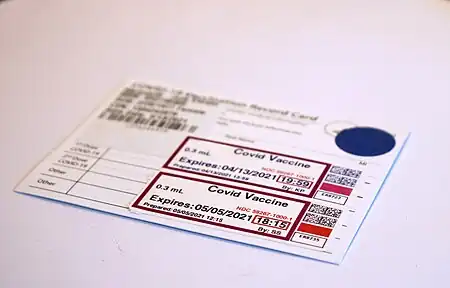 - ↑ Diaz, Jaclyn (8 June 2021). "Fake COVID Vaccine Cards Are Being Sold Online. Using One Is A Crime". NPR. Archived from the original on 19 October 2021. Retrieved 19 October 2021.