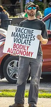 Soon after the start of the COVID-19 pandemic, preexisting anti-vaxxer social networks started online and in-person campaigns to discredit the developing COVID-19 vaccines targeting United States citizens.[6] Anti-vaccination influencers used Twitter and other social media platforms to spread vaccine misinformation.[6] Some in the medical field have given false credibility to vaccine hesitant beliefs. This caused the Federation of State Medical Boards to issue a statement in July 2021 that any physicians who generate and spread vaccine misinformation or disinformation would risk disciplinary action.[7][8]