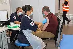 In December 2020, the military deployed planners to help with the COVID-19 vaccination rollouts in England, Wales and Scotland.[94][95] The military then helped with the construction of vaccination centres around the country, with the first in Bristol, England.[96]