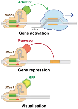 - ↑ Dominguez AA, Lim WA, Qi LS (January 2016). "Beyond editing: repurposing CRISPR-Cas9 for precision genome regulation and interrogation". Nature Reviews. Molecular Cell Biology. 17 (1): 5–15. doi:10.1038/nrm.2015.2. PMC 4922510. PMID 26670017.