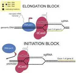 CRISPRi can sterically repress transcription by blocking either transcriptional initiation or elongation. This is accomplished by designing sgRNA complementary to the promoter or the exonic sequences. The level of transcriptional repression with a target within the coding sequence is strand-specific. Depending on the nature of the CRISPR effector, either the template or non-template strand leads to stronger repression.[14] For dCas9 (based on a Type-2 CRISPR system), repression is stronger when the guide RNA is complementary to the non-template strand. It has been suggested that this is due to the activity of helicase, which unwinds the RNA:DNA heteroduplex ahead of RNA pol II when the sgRNA is complementary to the template strand. Unlike transcription elongation block, silencing is independent of the targeted DNA strand when targeting the transcriptional start site. In prokaryotes, this steric inhibition can repress transcription of the target gene by almost 99.9%; in archaea, more than 90% repression was achieved;[15] in human cells, up to 90% repression was observed.[2] In bacteria, it is possible to saturate the target with a high enough level of dCas9 complex. In this case, the repression strength only depends on the probability that dCas9 is ejected upon collision with the RNA polymerase, which is determined by the guide sequence.[16] Higher temperatures are also associated with higher ejection probability, thus weaker repression.[16] In eukaryotes, CRISPRi can also repress transcription via an effector domain. Fusing a repressor domain to dCas9 allows transcription to be further repressed by inducing heterochromatinization. For example, the well-studied Krüppel associated box (KRAB) domain can be fused to dCas9 to repress transcription of the target gene up to 99% in human cells.[17]