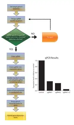 - ↑ Radzisheuskaya A, Shlyueva D, Müller I, Helin K (October 2016). "Optimizing sgRNA position markedly improves the efficiency of CRISPR/dCas9-mediated transcriptional repression". Nucleic Acids Research. 44 (18): e141. doi:10.1093/nar/gkw583. PMC 5062975. PMID 27353328.