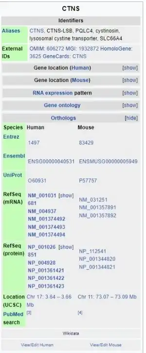 The CTNS gene is located on the p arm of human chromosome 17, at position 13.2.[2] It spans base pairs 3,636,468 and 3,661,542, and comprises 12 exons.[2][3]