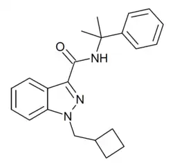 - ↑ Haschimi B, Grafinger KE, Pulver B, Psychou E, Halter S, Huppertz LM, et al. (August 2021). "New synthetic cannabinoids carrying a cyclobutyl methyl side chain: Human Phase I metabolism and data on human cannabinoid receptor 1 binding and activation of Cumyl-CBMICA and Cumyl-CBMINACA". Drug Testing and Analysis. 13 (8): 1499–1515. doi:10.1002/dta.3038. PMID 33788409.