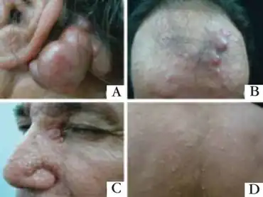 | a)Multilobular violaceous nodule b) erythematous papules and nodules c) normochromic papules on eyelids d) normochromicpapules on the back | |