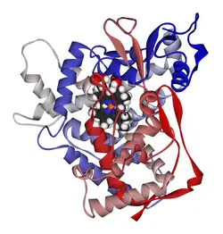 Cytochrome P450 family 2 subfamily C member 9 (abbreviated CYP2C9) is an enzyme protein. The enzyme is involved in the metabolism, by oxidation, of both xenobiotics, including drugs, and endogenous compounds, including fatty acids. In humans, the protein is encoded by the CYP2C9 gene.[5][6] The gene is highly polymorphic, which affects the efficiency of the metabolism by the enzyme.[7]