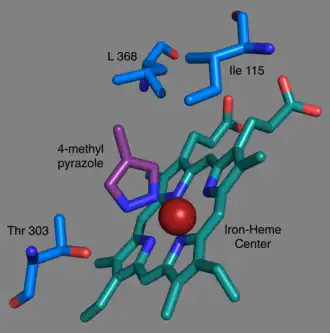 CYP2E1 is inhibited by a variety of small molecules, many of which act competitively. Two such inhibitors, indazole and 4-methylpyrazole, coordinate with the active site's iron atom and were crystallized with recombinant human CYP2E1 in 2008 to give the first true crystal structures of the enzyme.[14] Other inhibitors include diethyldithiocarbamate[21] (in cancer), and disulfiram[22] (in alcoholism).