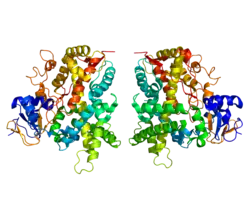 Cytochrome P450 2E1 (abbreviated CYP2E1, EC 1.14.13.n7) is a member of the cytochrome P450 mixed-function oxidase system, which is involved in the metabolism of xenobiotics in the body. This class of enzymes is divided up into a number of subcategories, including CYP1, CYP2, and CYP3, which as a group are largely responsible for the breakdown of foreign compounds in mammals.[5]