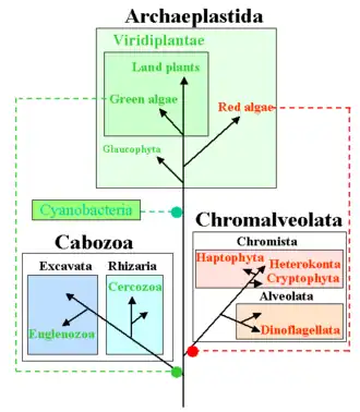 - ↑ Cavalier-Smith T (1999). "Principles of protein and lipid targeting in secondary symbiogenesis: euglenoid, dinoflagellate, and sporozoan plastid origins and the eukaryote family tree". J. Eukaryot. Microbiol. 46 (4): 347–66. doi:10.1111/j.1550-7408.1999.tb04614.x. PMID 18092388. S2CID 22759799.