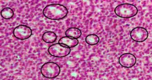Call–Exner bodies marked with black circles in an intermediate-high magnification micrograph of a granulosa cell tumour, a type of sex cord stromal tumour. H&E stain.