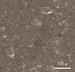 Calpionellids are an extinct group of eukaryotic single celled organisms of uncertain affinities. Their fossils are found in marine rocks of Upper Jurassic to Lower Cretaceous age.[1] They were planktonic organisms with urn-shaped, calcitic tests that had a widespread distribution across the Tethys Ocean from the late Tithonian to the early Valanginian and were characterised by rapid evolution, and their abundant remains in deep sea sediments from this interval are important as they allow long distance biostratigraphic correlation and precise dating.[2] Calpionellids were not confined to the Tethys, as they have also been found in the Vaca Muerta of northern Patagonia, in what was then the southeastern Pacific.[3] Calpionellids are divided into two main families, the Chitinoidellidae, which are the earliest members of the group, appearing in the mid Tithonian, characterised by microgranular lorica. Calpionellidae appear later, including widespread genera such as Calpionella and Calpionellites, and have combined microgranular and hyaline lorica. A third family, the Semichitinoidellidae are sometimes recognised.[4]