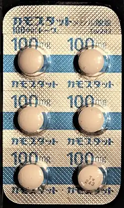- ↑ "医療用医薬品: カモスタットメシル酸塩 (カモスタットメシル酸塩錠100mg「日医工」)". KEGG (in Japanese). Retrieved 2021-02-05.