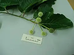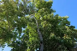 A eudicot,[3] it is a flowering deciduous tree with light gray bark.[4] It can grow to a height of 20 metres (66 ft). Its large, papery leaves are somewhat oval in shape, usually 12 to 28 cm (5 to 10 in) long and 6 to 12 cm (2 to 5 in) wide.[4] The flowers, which bloom from May through July, produce a gray-brown fruit with one seed in September.[4]