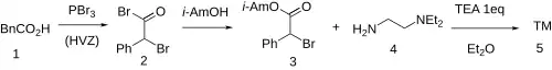 The Hell–Volhard–Zelinsky halogenation on phenylacetic acid [103-82-2] (1) gives 2-Bromo-2-phenylacetyl bromide, CID:15621041 (2). Treatment with isoamyl alcohol [123-51-3] gives 3-methylbutyl bromo(phenyl)acetate [92018-48-9] (3). Alkylation with N,N-Diethylethylenediamine [100-36-7] (4) completed the synthesis of Camylofin (5).