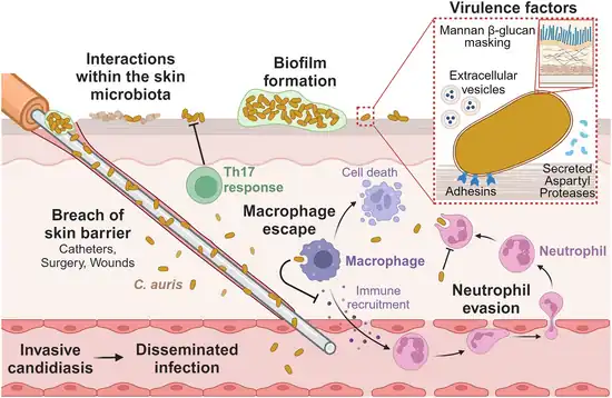 - ↑ Horton, Mark V.; Holt, Ashley M.; Nett, Jeniel E. (21 December 2023). "Mechanisms of pathogenicity for the emerging fungus Candida auris". PLOS Pathogens. 19 (12): e1011843. doi:10.1371/journal.ppat.1011843. ISSN 1553-7374.