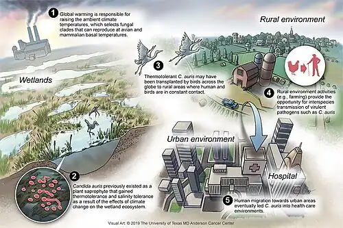 - ↑ Casadevall A, Kontoyiannis DP, Robert V (July 2019). "On the Emergence of Candida auris: Climate Change, Azoles, Swamps, and Birds". mBio. 10 (4): e01397–19. doi:10.1128/mBio.01397-19. PMC 6650554. PMID 31337723.