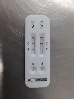 - ↑ Oh J, Ha G, Cho Y, Kim M, An D, Hwang K, Lim Y, Park B, Kang B, Song D (2006). "One-Step Immunochromatography Assay Kit for Detecting Antibodies to Canine Parvovirus". Clin. Vaccine Immunol. 13 (4): 520–4. doi:10.1128/CVI.13.4.520-524.2006. PMC 1459639. PMID 16603622.