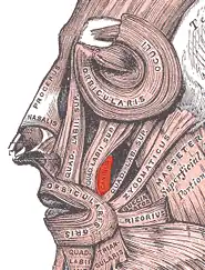 The canine space (also termed the infra-orbital space)[1] is a fascial space of the head and neck (sometimes also termed fascial spaces or tissue spaces). It is a thin potential space on the face, and is paired on either side. It is located between the levator anguli oris muscle inferiorly and the levator labii superioris muscle superiorly.[1][2] The term is derived from the fact that the space is in the region of the canine fossa, and that infections originating from the maxillary canine tooth may spread to involve the space. Infra-orbital is derived from infra- meaning below and orbit which refers to the eye socket.