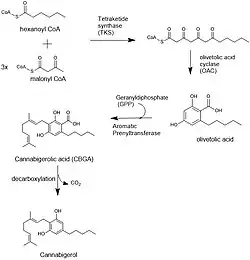 The biosynthesis of CBG begins by loading hexanoyl-CoA onto a polyketide synthase assembly protein and subsequent condensation with three molecules of malonyl-CoA.[21] This polyketide is cyclized to olivetolic acid via olivetolic acid cyclase, and then prenylated with a ten carbon isoprenoid precursor, geranyl pyrophosphate, using an aromatic prenyltransferase enzyme, geranyl-pyrophosphate—olivetolic acid geranyltransferase, to biosynthesize cannabigerolic acid, which can then be decarboxylated to yield CBG.[2][4]