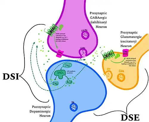 In the brain, the canonical mechanism of CB1 receptor activation is a form of short-term synaptic plasticity initiated via retrograde signaling of endogenous CB1 agonists such as 2AG or AEA (two primary endocannabinoids). This mechanism of action is called depolarization-induced suppression of inhibition (DSI) or depolarization-induced suppression of excitation (DSE),[18] depending on the classification of the presynaptic neuron acted upon by the retrograde messenger (see diagram at left). In the case of CB1R agonism on the presynaptic membrane of a GABAergic interneuron, activation leads to a net effect of increased activity, while the same activity on a glutamatergic neuron leads to the opposite net effect. The release of other neurotransmitters is also modulated in this way, particularly dopamine, dynorphin, oxytocin, and vasopressin.[18]